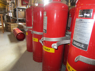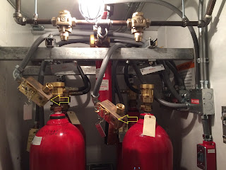 The following photo shows a diesel generator room protected by a zoned CO-2 system. The fire door is incorrectly propped open.