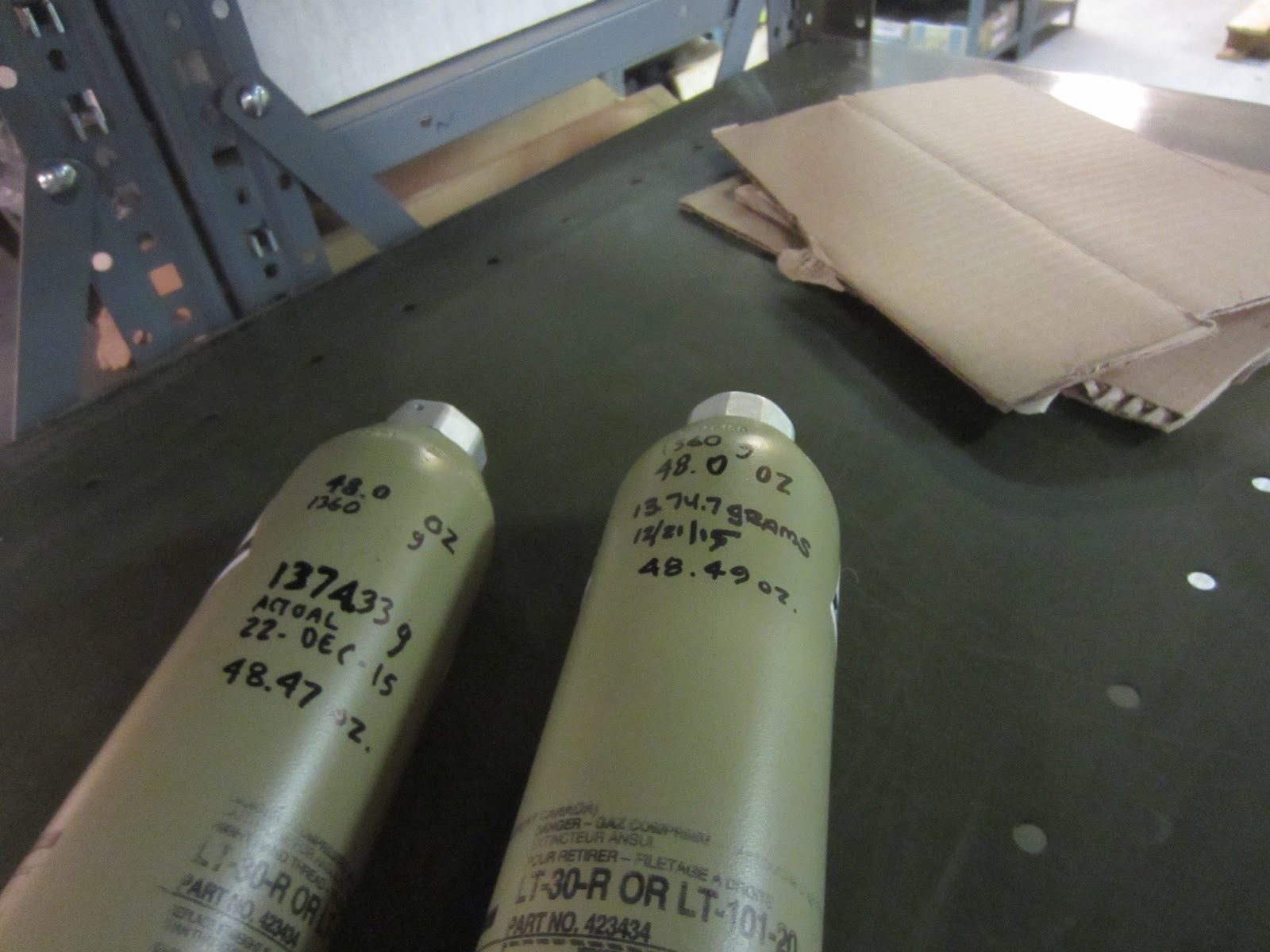 The photo below shows two (2) CO-2 cylinders. They were last weighted in 2014. The photo was taken in Spring 2016:
