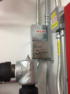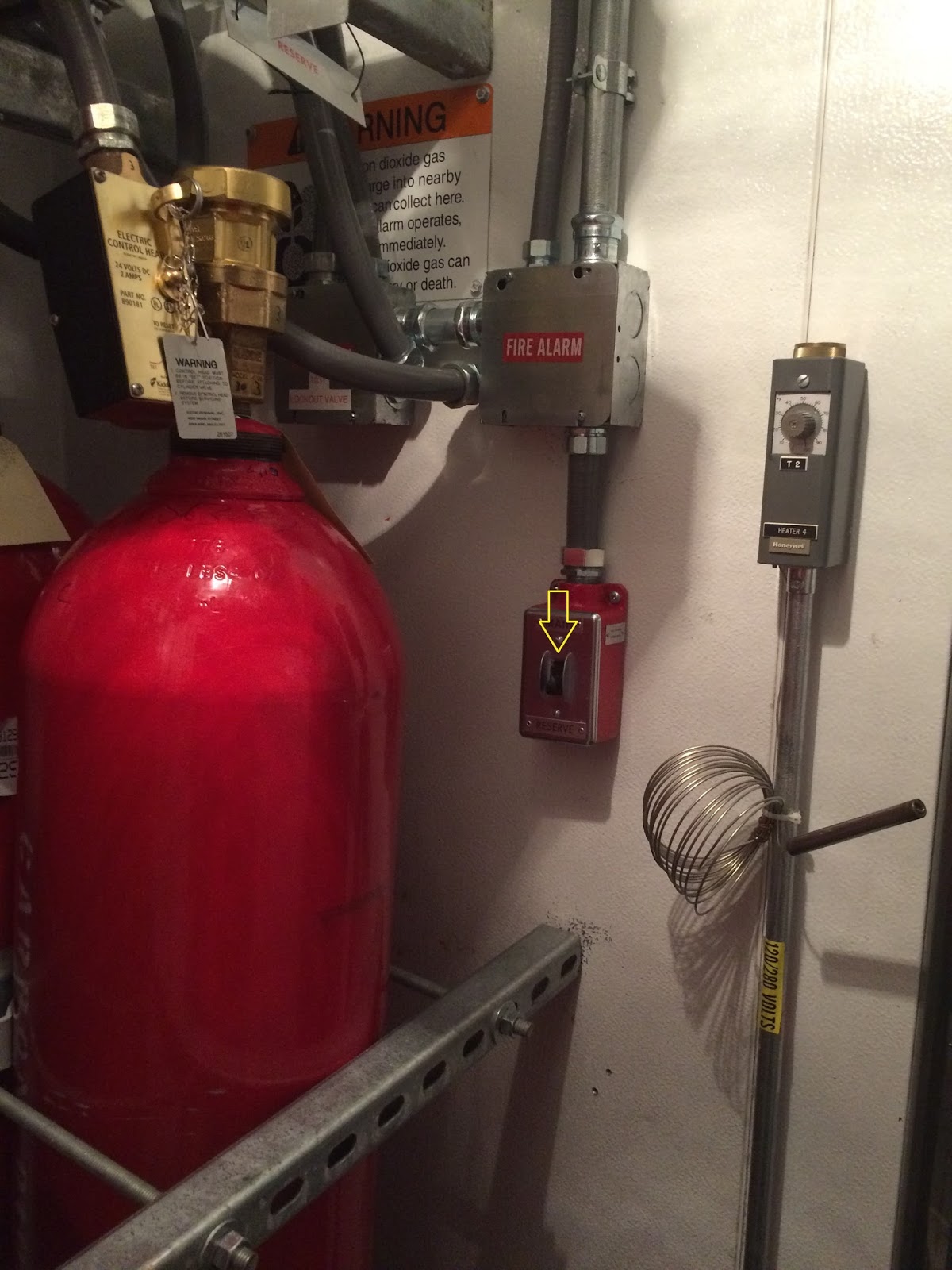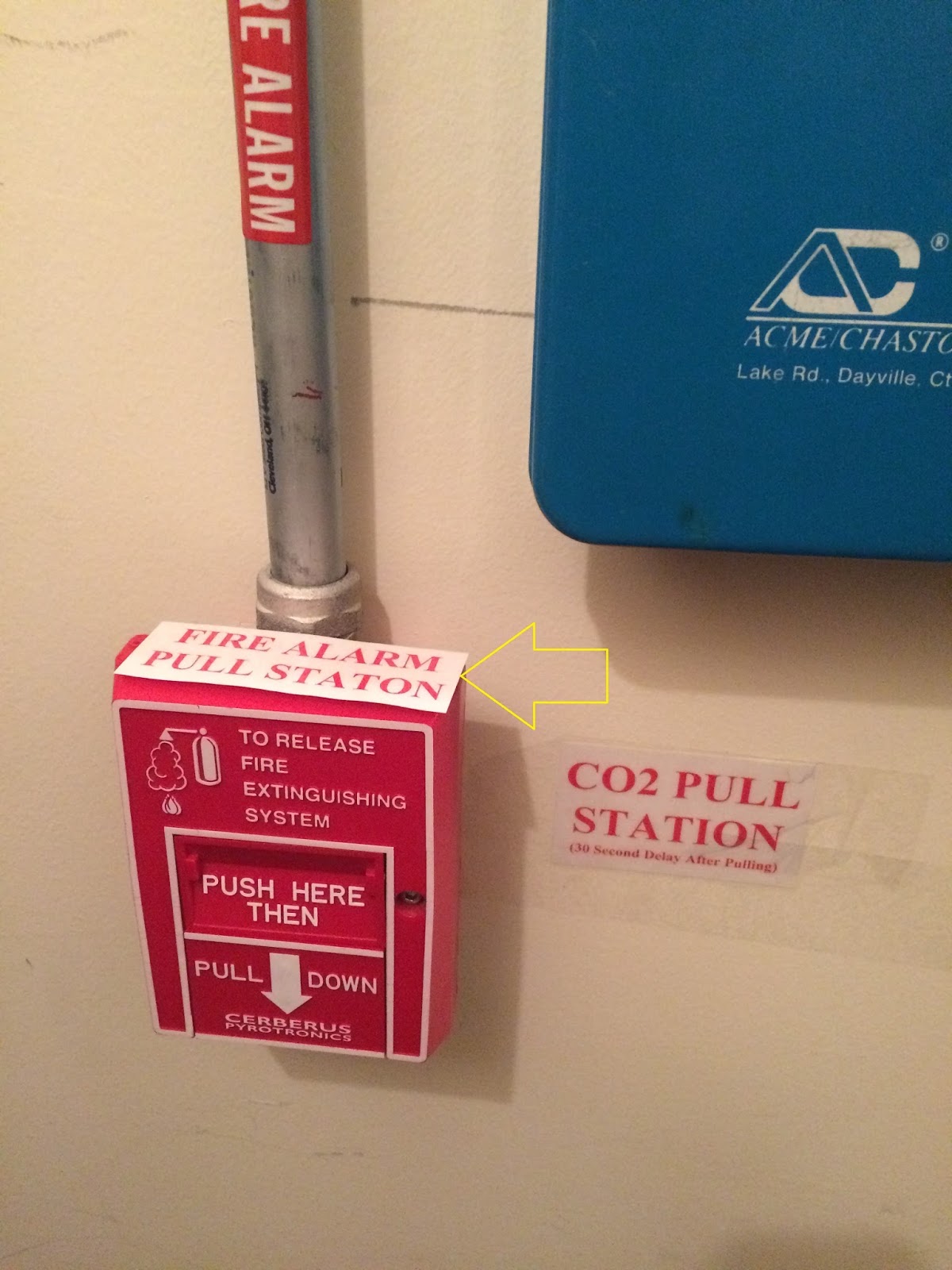 Below a photo of a CO-2 releasing pull station. Notice the contradictory signage: