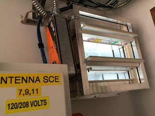 Below, the exterior of an electronics cabinet for a satellite earth station is shown. An exterior heat exhaust louver is shown. Often these do not close on CO-2 (or other clean agent activation):