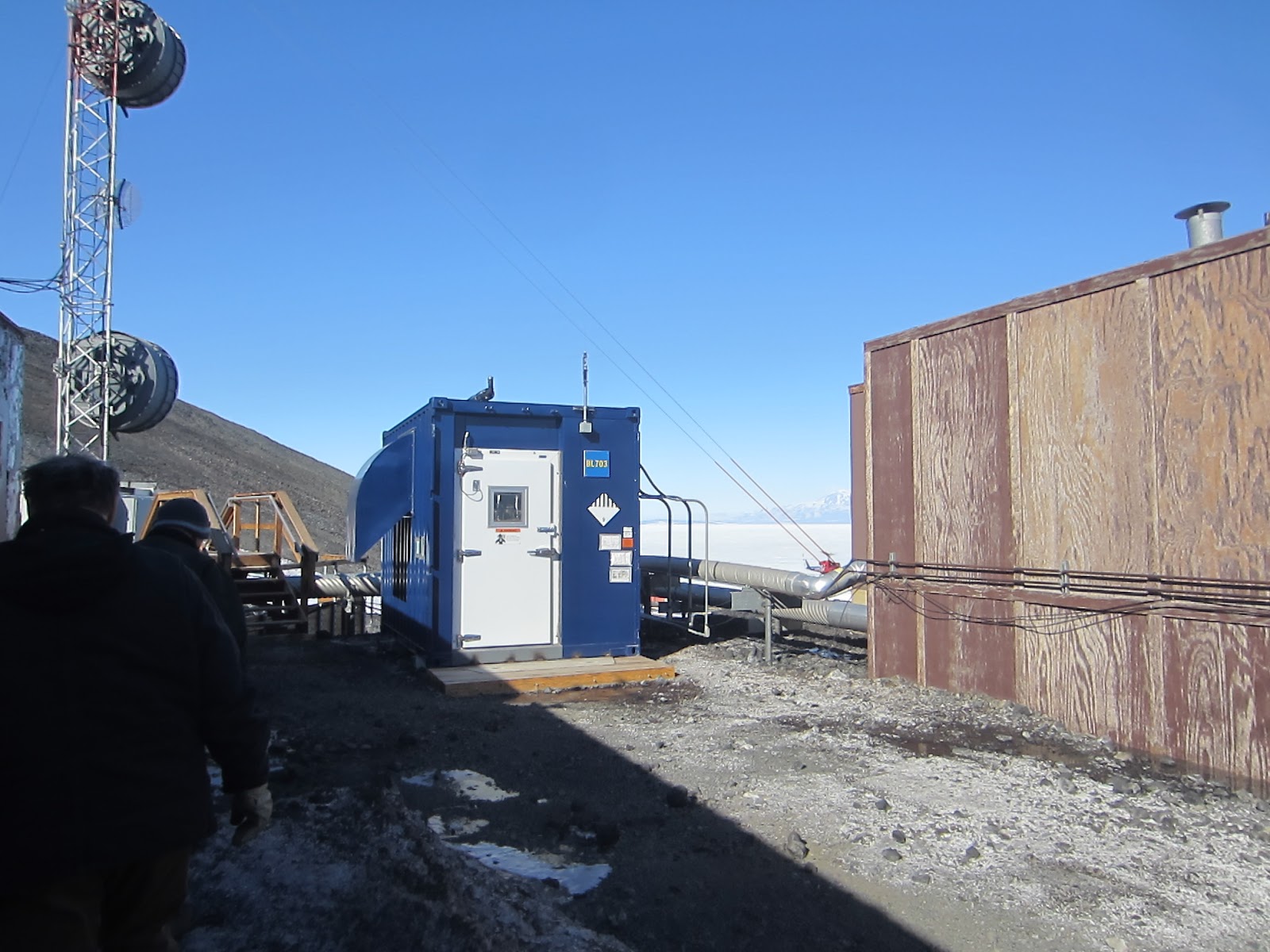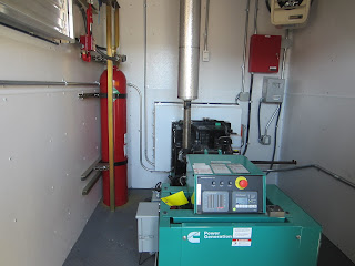 Photographed below ("blue box") is a CO-2 protected diesel generator. A cross-zoned fire alarm & releasing system is also installed. Central station service is provided by a 1W VHF radio network, the F/A radio antenna (to the upper right of the door) can be seen on the front of the blue conex box: